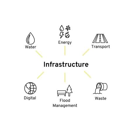 Infrastructure underpins the economy. The government wants to deliver an infrastructure revolution: a radical improvement in the quality of the UK’s infrastructure to help level up the country, strengthen the Union, and put the UK on the path to net zero emissions by 2050 – set out in the National Infrastructure Strategy.1 They key infrastructure sectors that the National Infrastructure Commission focus on are; Transport, Energy, Digital, Water, Waste and Sewage, and Flood Management.