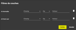 Champ : sélection d’un attribut de la couche dans une liste. La liste contient les attributs de la couche pouvant être utilisés pour un filtre ( « global-id », « guid », « oid » , « string », « double », « integer » ou « long ») ;