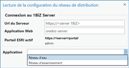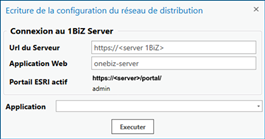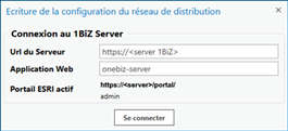 Lance la Connexion au serveur 1Biz, en utilisant le portal courant d’ArcGIS Pro et l’utilisateur qui y est connecté, avec le bouton « Se connecter ». |
