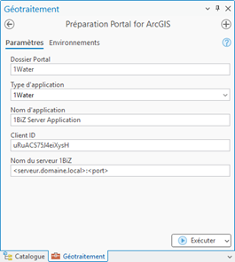 Paramètres : ► Dossier Portal : nom du dossier de rangement Portal qui doit contenir l’application et les autres éléments à créer ; ► Type de l’application : choix parmi les applications mobiles du serveur 1BiZ : - 1Water - 1Lighting ► Nom de l’application : libellé de l’application Portal pour information ; ► Client ID : clé d’identification OAuth2 pour le serveur 1BiZ ; ►