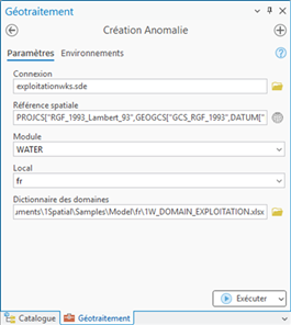 Paramètres : ► Connexion : connexion vers la source de données d’exploitation ; ► Référence spatiale : référence à utiliser (la même que celle du réseau de distribution associé) ; ► Module : Application concernée par la création du modèle anomalie : - ALL : applications « Eau » et « Assainissement » ; - WATER : application « Eau » ; - SANITATION : application « Assainissement ». ► Local : Langue des alias et valeurs de domaines (fr ou en) ; ► Dictionnaire des domaines : fichier Excel contenant la définition de tous les domaines du modèle d’exploitation. |