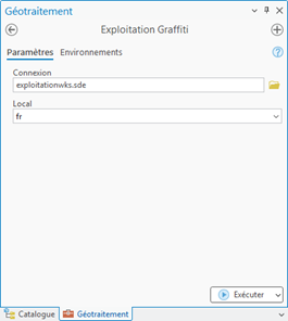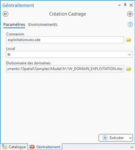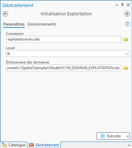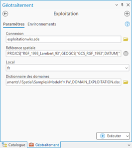 Paramètres : ► Connexion : Définition de la source d’exploitation à mettre à jour ; ► Local : Langue des alias et valeurs de domaines (fr ou en) ; ► Dictionnaire des domaines : Fichier Excel contenant la définition de tous les domaines du modèle d’exploitation. ! Les paramètres « Local » et « Dictionnaire des domaines » sont présents seulement si nécessaires. |