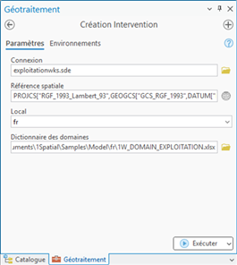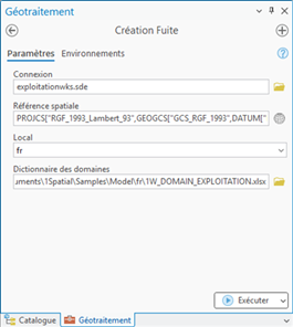 Paramètres : ► Connexion : connexion vers la source de données d’exploitation ; ► Référence spatiale : référence à utiliser (la même que celle du réseau de distribution associé) ; ► Local : Langue des alias et valeurs de domaines (fr ou en) ; ► Dictionnaire des domaines : fichier Excel contenant la définition de tous les domaines du modèle d’exploitation. |