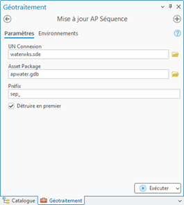 Paramètres : ► UN Connexion : Connexion vers la base du réseau de distribution ; ► Asset Package : Connexion vers l’Asset Package ; ► Préfixe : Préfixe des séquences à récupérer ; ► Détruire en premier : Case à cocher pour vider la liste avant le remplissage. |