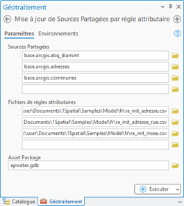 Paramètres : ► Sources partagées : Liste des sources partagées à mettre en nom pleinement qualifié (<base>.<schema>.<nom>) ; ► Fichiers de règles attributaires : Liste des fichiers de règles attributaire à mettre à jour (facultatif) ; ► Asset Package : Asset Package à mettre à jour (facultatif). Les deux dernier paramètres peuvent être définis tous les deux ou un seul des deux. |