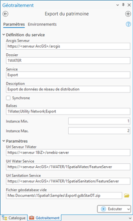 Paramètres de définition du service : ► Arcgis Serveur : Url du serveur ArcGIS ou le service sera publié (obligatoirement fédéré au portal courant) ; ► Dossier : Dossier de stockage du service (Portal et ArcGIS Server) ; ► Service : Nom du service ; ► Description : texte libre de description du service ; ► Synchrone : Case à cocher de synchronicité de l’opération ; ► Balises : Liste de balises de recherche ; ► Instance Min. : Nombre d’instance(s) minimum du service ; ► Instance Max. : Nombre d’instance(s) maximum du service. Paramètres de la tâche : ► Url serveur 1Water : Url du serveur 1BiZ pour la validation des droits de l’export ; ► Url Water Service : Url d’accès aux données du réseau de distribution d’eau potable ; ► Url Sanitation Service : Url d’accès aux données du réseau de distribution d’assainissement ; ► Fichier géodatabase vide : Fichier « gdbStarDT.zip » livré dans « Mes Documents/1Spatial/Samples/Export » pour l’export StaR-DT. |