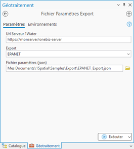 Paramètres : ► Url serveur 1Water : Url du serveur 1BiZ pour la validation des droits de l’export ; ► Export : Format d’export de données (EPANet, SWMM, ...) ; ► Fichier paramètres (json) : Fichier au format json d’export vers le format indiqué dans le champ « Export ». |