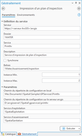 Paramètres de définition du service : ► Serveur : URL obligatoire du serveur ArcGIS (ex : https://sig.maville.fr/arcgis) ; ► Dossier : Dossier de stockage, créé au niveau de la configuration du portail, du service dans le serveur (ex : 1WATER) ; ► Service : Nom du service (conserver la valeur par défaut) ; ► Description : Texte libre de description du service ; ► Synchrone : Type de service non coché par défaut (ne pas modifier) ; ► Balises : Liste de balises de recherche ; ► Instance Min. : Nombre d’instance(s) minimum du service ; ► Instance Max. : Nombre d’instance(s) maximum du service. Paramètres de la tâche : ► Chemin du répertoire de configuration en local : Répertoire contenant les fichiers « .template » pour générer les fichiers modèles (« PrintItv.mapx », « PrintItv.pagx » et « setting.json ») en local ( ex : <1NM_folder>\Samples\GPServices\PrintItv) ; ► Chemin du répertoire de configuration sur le serveur arcgis : Répertoire destination des fichiers modèles (« PrintItv.mapx », « PrintItv.pagx » et « setting.json ») à recopier manuellement sur le serveur ArcGIS après l’exécution du géotraitement (ex : D:\arcgisserver\1spatial\gpservices\printitv) ; ► Service d’exploitation : Nom du service d’exploitation (ex : 1SpatialExploitation ) ; ► Service d’assainissement : Nom du