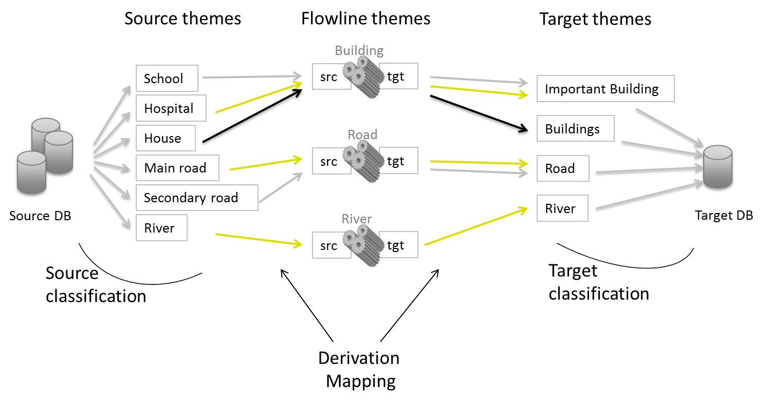 The following figure illustrates the links between the main concepts of 1Generalise. In this example, they are linked using a profile that has been set up. The source themes are loaded from one or more input datasets using the source classification. A similar step was applied to create the target themes from the output dataset using the target classification. The flowline in use is represented by just three themes: building, road, and river.
