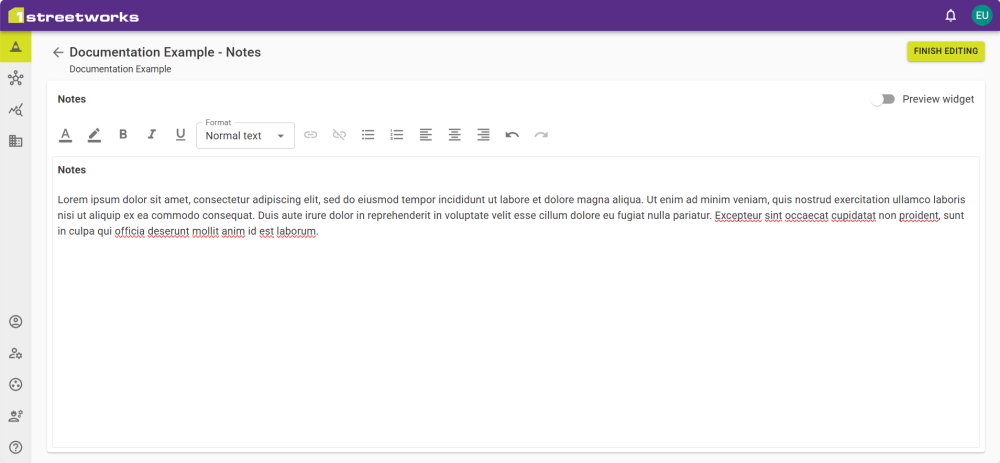 Toggle Preview Widget to switch between the text editor and widget preview. The preview uses the size of the widget to give an accurate depiction of what will be shown on the PDF page.