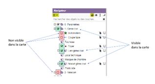 Exemple : « nœud génie civil » sera affiché s’il est coché et que le groupe « Génie civil » est coché. Le groupe « Télécom » est décoché donc tous les calques de ce groupe ne sont pas affichés dans la carte même s’ils sont cochés.