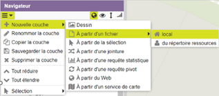 Pour importer des données au format shp dans la carte, utiliser soit un simple Glisser et Déposer, soit la fonction Nouvelle couche/A partir d’un fichier/Local du menu Navigation.