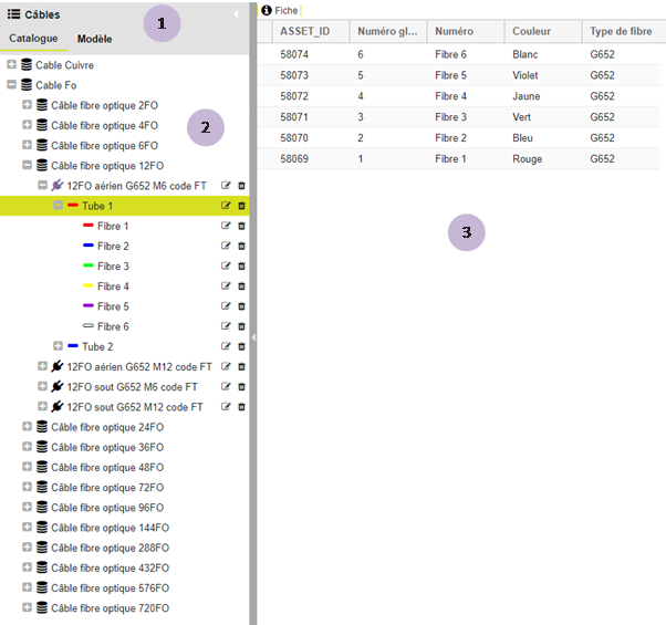 En général il faut créer un modèle de câble par combinaison type de fibre / code couleur.