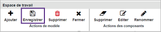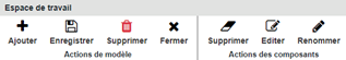 ► Aller dans l’onglet « Espace de travail » : Le groupe d’actions « Actions de modèle » impacte le gabarit en lui-même. ► Le groupe d’actions « Actions des composants » impacte les composants constituant le gabarit courant. |