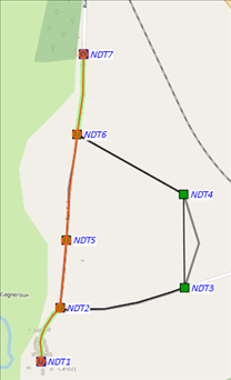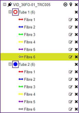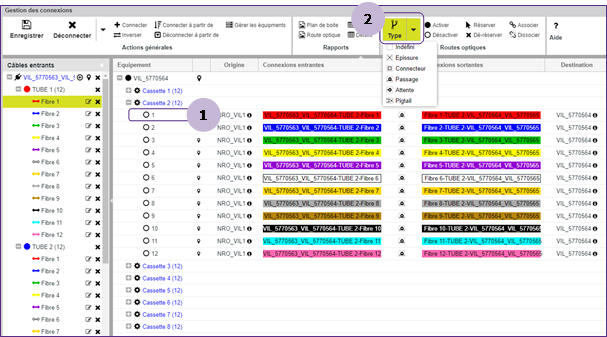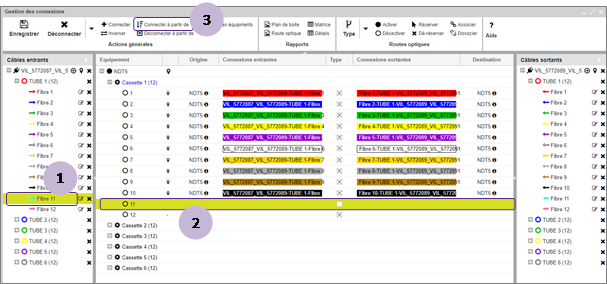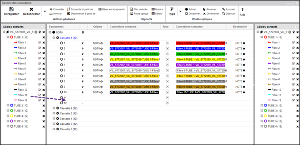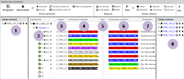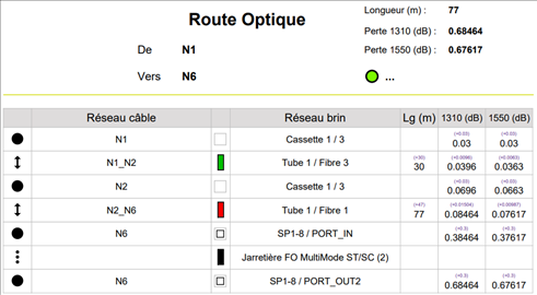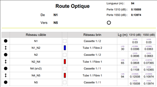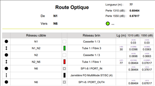 L’interface affiche le détail des éléments de la route optique. La route peut être composée : ► de liens (les flèches verticales) ; ► de nœuds (les ronds pleins) ; ► de jarretières (les trois points verticaux). |