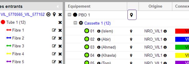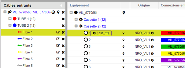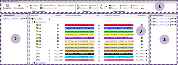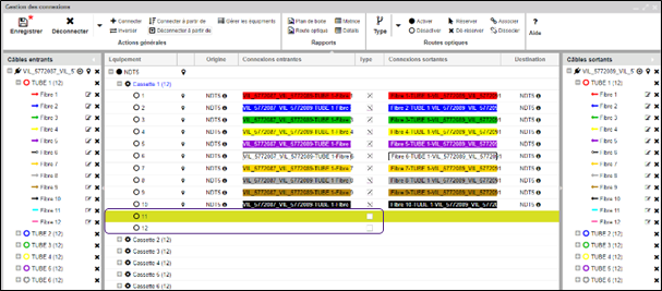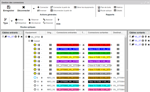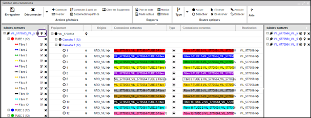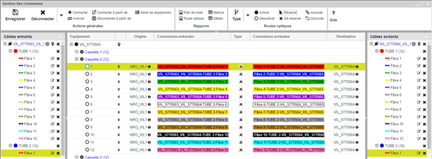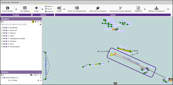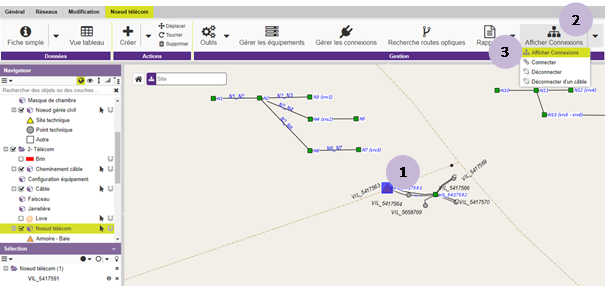 Fonctionnalité d’affichage des connexions pour pouvoir traiter des objets qui sont entre deux étages ou connectés entre deux étages. En effet, de par sa verticalité, l’objet existe mais on ne peut pas le voir sur la carte (néanmoins il a des attributs, on peut donc travailler dessus). Une interface s’ouvre également sur le côté où l’objet principal est le nœud sélectionné. Cette interface montre à la fois les objets connectés et les objets inter étages connectés qui n’ont pas de géométrie mais qui existent, ce qui permet de les exploiter et de les suivre (accès aux fiches et commandes). Pour plus détails consulter
