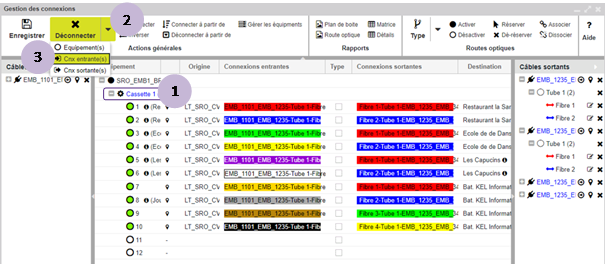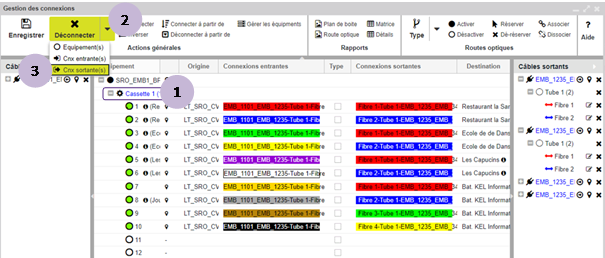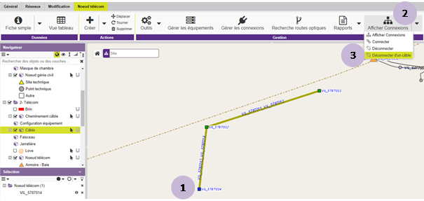 Cliquer sur « Déconnecter d’un câble » et Sélectionner le câble à déconnecter du nœud :