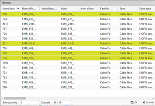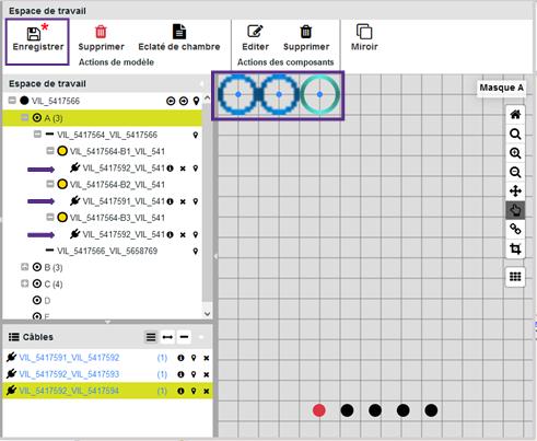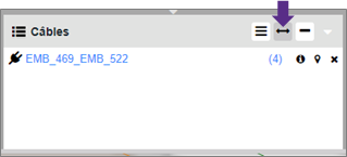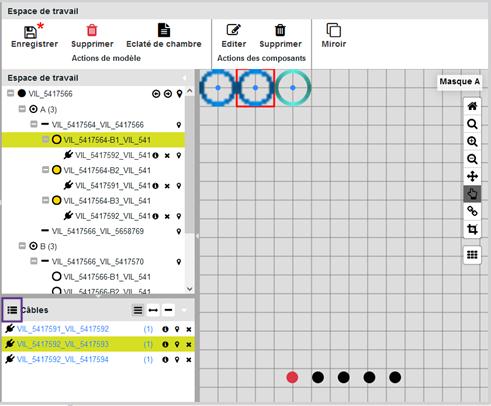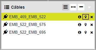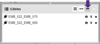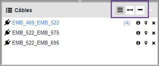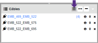 Dans la partie des câbles, les trois commandes encadrées filtrent la visualisation /sélection des câbles listés en :