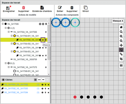 Dans l’espace de travail sélectionner le câble, puis cliquer sur la commande encadrée pour le dissocier du fourreau.