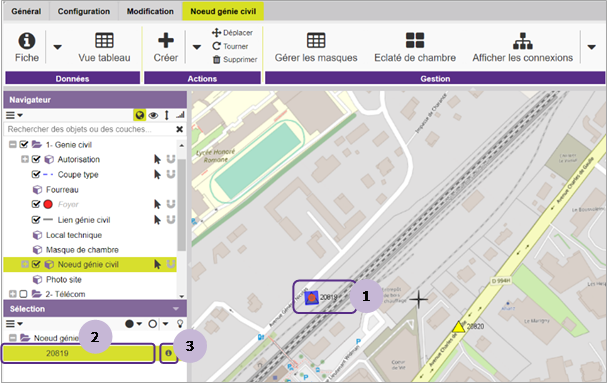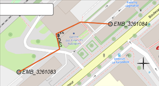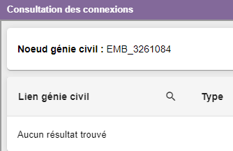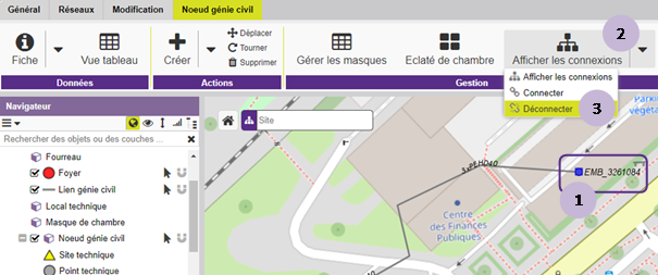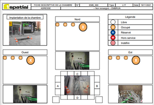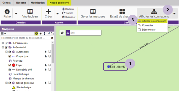 Fonctionnalité d’affichage des connexions pour pouvoir traiter des objets qui sont entre deux étages ou connectés entre deux étages. En effet, de par sa verticalité, l’objet existe mais on ne peut pas le voir sur la carte (néanmoins il a des attributs, on peut donc travailler dessus). Une interface s’ouvre également sur le côté où l’objet principal est le nœud sélectionné et montre à la fois les objets connectés et les objets inter étages connectés qui n’ont pas de géométrie mais qui existent, ce qui permet de les exploiter et de les suivre (accès aux fiches et commandes). Pour plus détails consulter