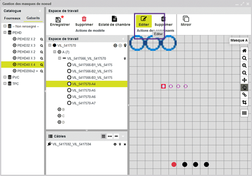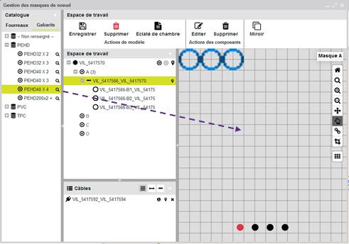 Sélectionner un type de câble et glisser/déposer dans le fourreau, au cœur de la vue graphique.