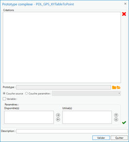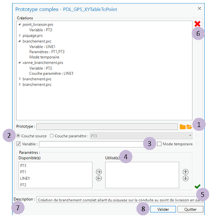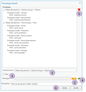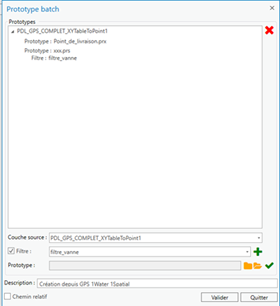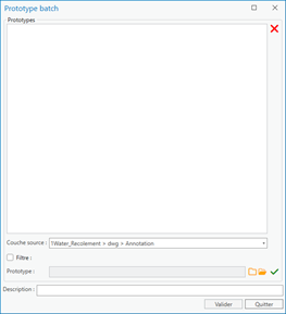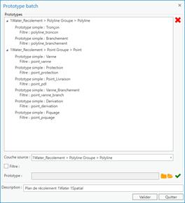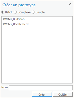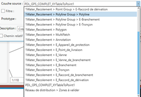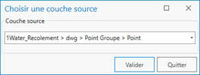 ! Un message d’avertissement est affiché si le nom saisi correspond déjà à un prototype de même type. Le nom de prototype doit être unique pour un type donné. ! Pour un prototype complexe ou un prototype simple, une boite de choix de couche source s’affiche avec les sources compatibles. Sélectionner la couche source à utiliser.
