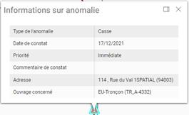 Consulte les informations d’une anomalie sous la forme d’une fenêtre contextuelle en cliquant dessus dans la carte. ! Cette fonctionnalité est disponible uniquement si la thématique « Anomalie » est activée. |