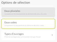 des ouvrages du curage s’actualise. ► Aucune option sélectionnée : tous les ouvrages du curage sont présents dans la liste. ► Option « A faire » sélectionnée : les ouvrages qui restent à faire à la date de l’opération de curage courante sont présents dans la liste. ► Option « Fait » sélectionnée : les ouvrages qui sont réalisés à la date de l’opération de curage courante sont présents dans la liste. ► Option « Inaccessible » sélectionnée : les ouvrages