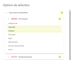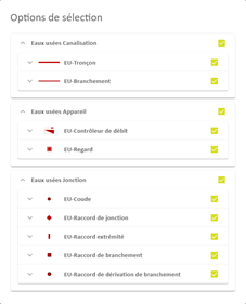 Dans le filtre par défaut : ► coche ou décoche le(s) domaine(s) ou la(es) source(s) de données (Canalisation, Appareil ou Jonction) pour un choix multiple ou sélectionne dans chaque source les types d’équipement à prendre en compte ; ► Ou sélectionne le filtre de sélection personnalités à activer. Clique en dehors