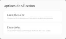filtre permet d’affiner la portée de la sélection faite dans la carte). Les filtres de sélection personnalisés sont affichés dans l’ordre dans lequel ils ont été définis par l’administrateur. Le filtre par défaut est affiché à la suite de la liste des filtres personnalisés (« Types d’ouvrages »). Si un filtre de sélection personnalisé est actif, son nom est indiqué dans le tooltip du bouton « Options de sélection » et le bouton est colorisé :