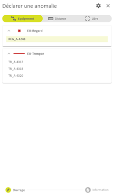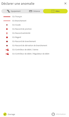 Anomalie libre : permet de déclarer une anomalie sur un ouvrage qui n’est pas représenté dans la carte (inexistant en base de données) en indiquant l’emplacement dans la carte. |