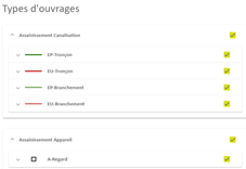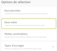 Dans le filtre par défaut : ► coche ou décoche le(s) domaine(s) ou la(es) source(s) de données (Canalisation, Appareil ou Jonction) pour un choix multiple ou sélectionne dans chaque source les types d’équipement à prendre en compte ; ► Ou sélectionne le filtre de sélection personnalités à activer. Clique en dehors de la fenêtre pour revenir à la sélection dans la carte. |