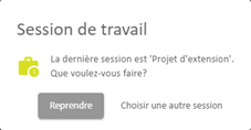 ! Si l’utilisateur n’a pas encore de session, une session « __DEFAULT__ » est automatiquement créée et activée. ! Si l’utilisateur possède une seule session, elle est activée. ! Si l’utilisateur possède plusieurs sessions (droits de multisessions), une demande lui propose d’activer la dernière session utilisée.