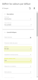 ! Si des valeurs par défaut au niveau modèle ou au niveau modèle d’entité sont définies, elles sont indiquées. ! Si des valeurs par défaut utilisateur ont déjà été définies, elles sont indiquées avec la couleur de surbrillance. Pour plus de précision sur la boite de gestion des valeurs par défaut, voir le chapitre « Valeurs par défaut ». |