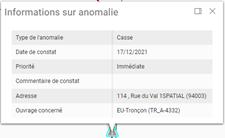 Consulte les informations d’une anomalie sous la forme d’une fenêtre contextuelle en cliquant dessus dans la carte. ! Cette fonctionnalité est disponible uniquement si la thématique « Anomalie » est activée. |
