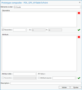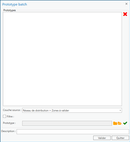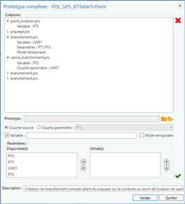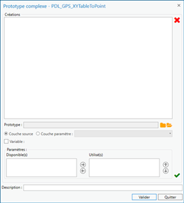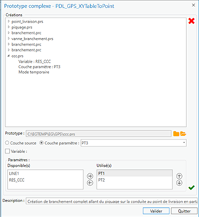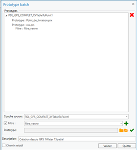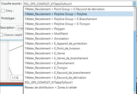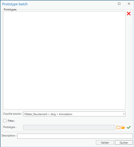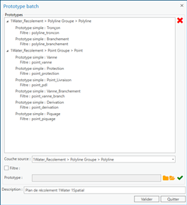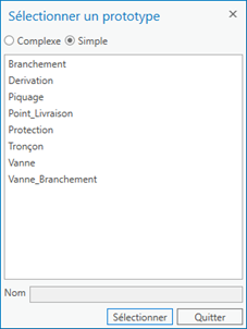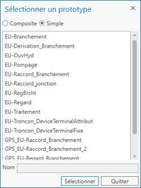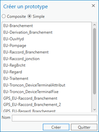 ! Un message d’avertissement est affiché si le nom saisi correspond déjà à un prototype de même type. Le nom de prototype doit être unique pour un type donné. ! Pour un prototype complexe ou un prototype simple, une boite de choix de couche source s’affiche avec les sources compatibles. Sélectionner la couche source à utiliser.