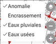 L’affichage est, de manière générale, géré par les modules de l’application. Ainsi les anomalies sont visibles lorsque le module Anomalies est activé et masquées lorsque le module Anomalies est désactivé. Il est néanmoins possible de gérer l’affichage d’un ensemble de couches via le filtre d’affichage disponible dans les boutons de la carte.