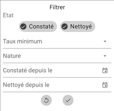! Le champ « Nettoyé depuis le » n’est visible que si l’état « Nettoyé » est sélectionné. ! Pour les champs de type date, seuls les encrassements dont la date (constatation ou nettoyage) est supérieure ou égale à la date indiquée seront prises en compte. |