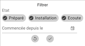 ! Les prélocalisations à l’état « Terminé » ne sont pas visibles dans la carte ni dans la liste. ! Le critère « Commencée depuis le » permet de filtrer les prélocalisations dont la date de début d’écoute est supérieure ou égale à la date indiquée. |