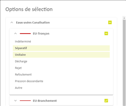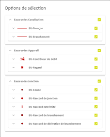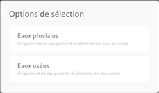 Dans le filtre par défaut : ► coche ou décoche le(s) domaine(s) ou la(es) source(s) de données (Canalisation, Appareil ou Jonction) pour un choix multiple ou sélectionne dans chaque source les types d’équipement à prendre en compte ; ► Ou sélectionne le filtre de sélection personnalités à activer. Clique en dehors