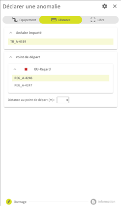 Anomalie par distance : permet de déclarer une anomalie sur un tronçon en partant de l’un de ces nœuds en extrémité et à une distance donnée. |