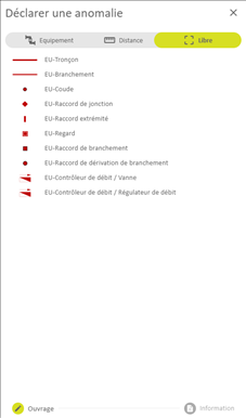 Anomalie libre : permet de déclarer une anomalie sur un ouvrage qui n’est pas représenté dans la carte (inexistant en base de données) en indiquant l’emplacement dans la carte. |