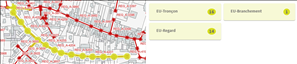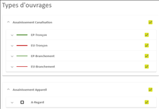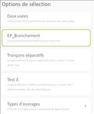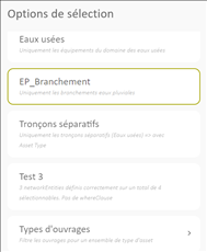 Coche ou décoche le(s) domaine(s) ou la(es) source(s) de données (Canalisation, Appareil ou Jonction) pour un choix multiple ou sélectionne dans chaque source les types d’équipement à prendre en compte. Clique en dehors de la fenêtre pour revenir à la sélection dans la carte. |