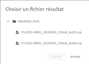 Importe le fichier résultat d’une inspection dont le fichier résultat a été déposé sur le serveur mais le rapprochement automatique n’a pas été réalisé. Le fichier résultat à prendre en compte doit être sélectionné manuellement. |
