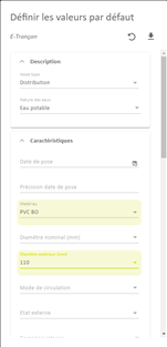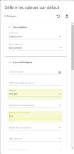 ! Si des valeurs par défaut au niveau modèle ou au niveau modèle d’entité sont définies, elles sont indiquées. ! Si des valeurs par défaut utilisateur ont déjà été définies, elles sont indiquées avec la couleur de surbrillance. Pour plus de précision sur la boite de gestion des valeurs par défaut, voir le chapitre « Valeurs par défaut ». |