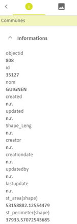 L’élément est mis en évidence dans la carte avec la couleur de l’élément courant dans la sélection. Les autres éléments sont mis en évidence avec la couleur de sélection. Les informations de l’objet courant de la sélection s’affichent dans le formulaire.