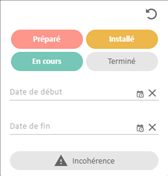 valeurs, plages de date, pour afficher : ► L’état ; ► La période entre deux dates ; ► L’indicateur d’incohérence. ! Les deux dates sont à renseigner obligatoire afin de fournir un intervalle dans lequel effectuer le filtre. |