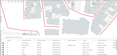 Les lignes cochées  sont surlignées dans le tableau et les objets correspondants mis en évidence dans la carte en mode sélection.
