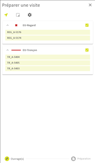 jour dans la liste et dans la carte avec le code couleur associé. ! Si l’ouvrage a été ajouté au cours de l’opération de visite courante (non programmé à la préparation), il est retiré de la visite et n’apparait plus, ni dans la liste, ni dans la carte. |