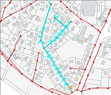 Propagation en aval : permet à l’utilisateur de rechercher les collecteurs en aval d’un point du réseau, pour simuler la propagation d’une pollution dans le réseau d’assainissement. |